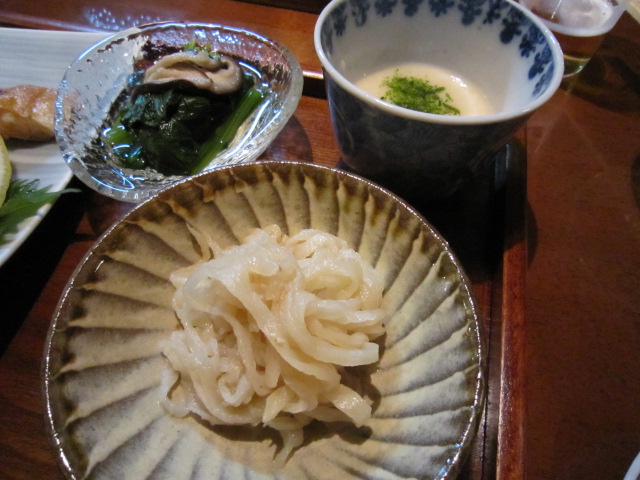小鉢の切り干し大根や青菜のお浸しもやさしい味付けで、